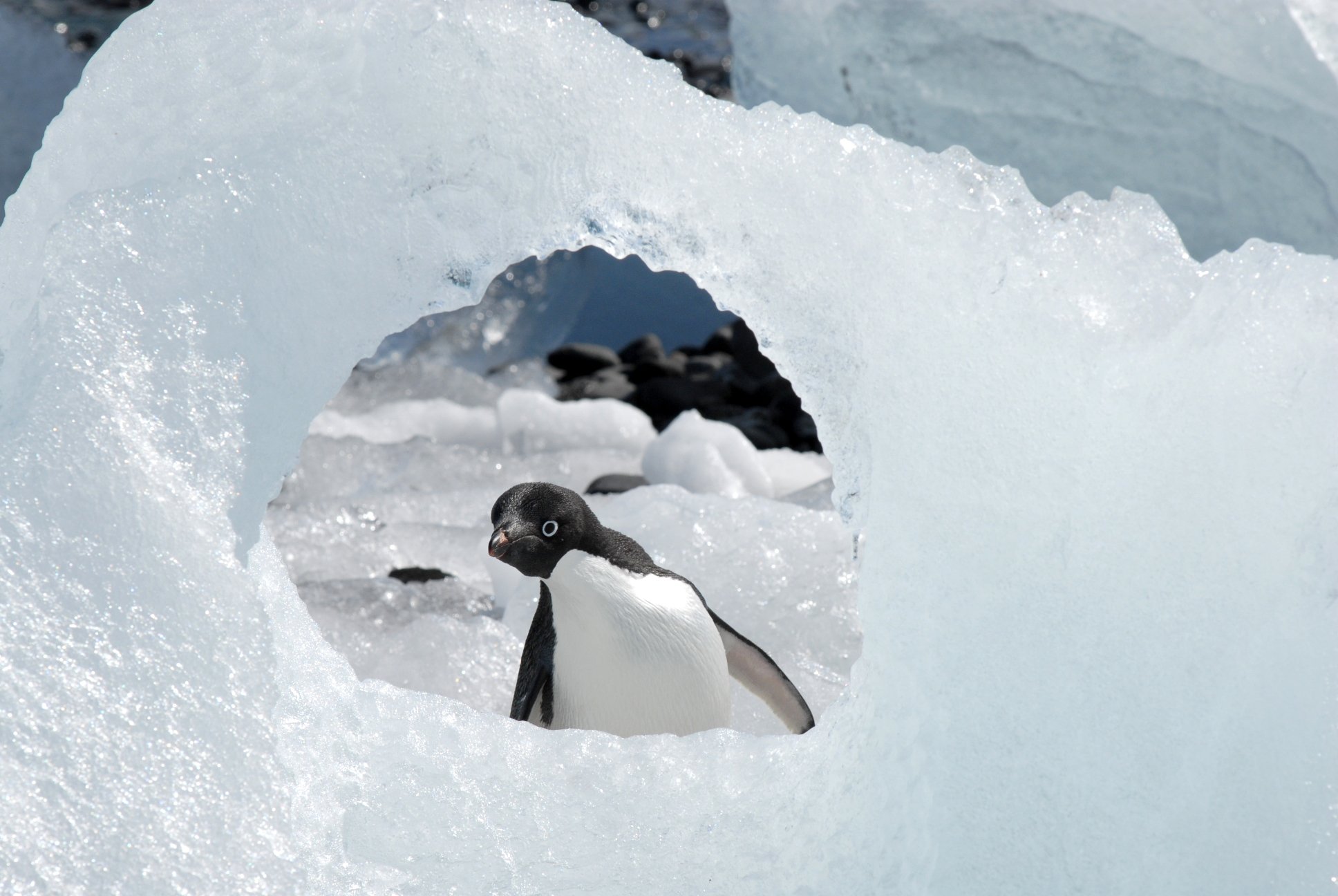An Adele Penguin playing peek-a-boo through an ice window on Paulet Island, Antarctica.