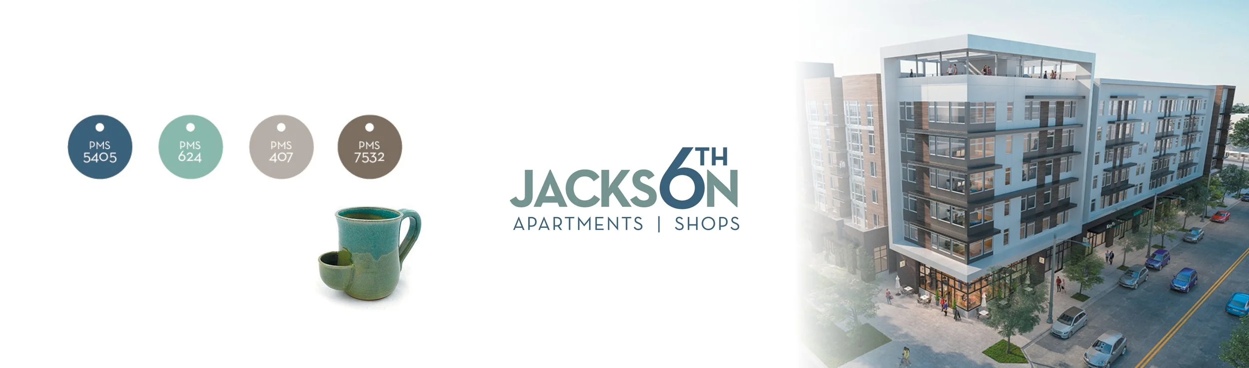 The identity for the community of Sixth & Jackson revolves around a simple, graphic and memorable word mark that uses the number six to complete the “O” in Jackson. It’s clean, bold lines and font were selected to provide nice visual weight in many branding situations.